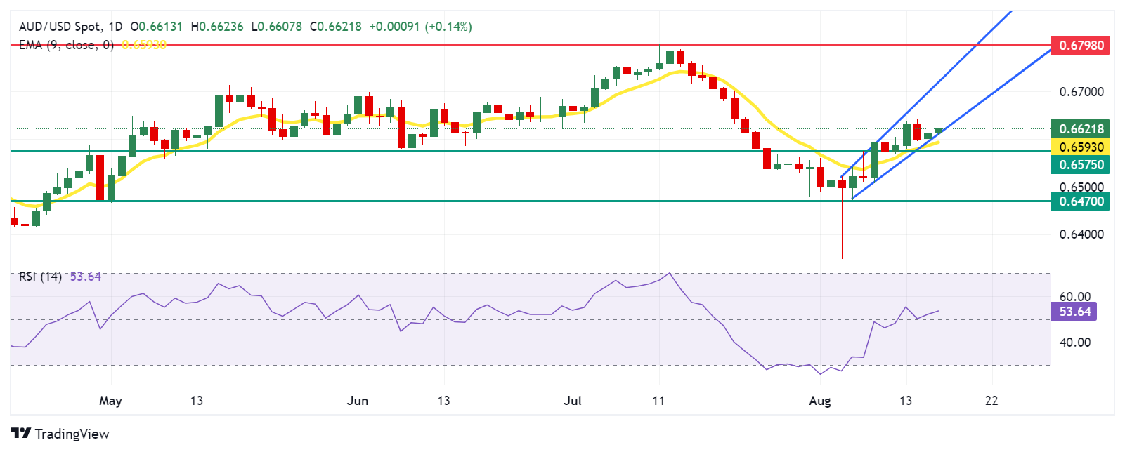 The Australian Dollar trades around 0.6620 on Friday. According to daily chart analysis, the AUD/USD pair is testing the lower boundary of an ascending channel. A break below this level could indicate a weakening of the bullish trend. Additionally, the 14-day Relative Strength Index (RSI) is slightly above the 50 mark, supporting the current bullish momentum.