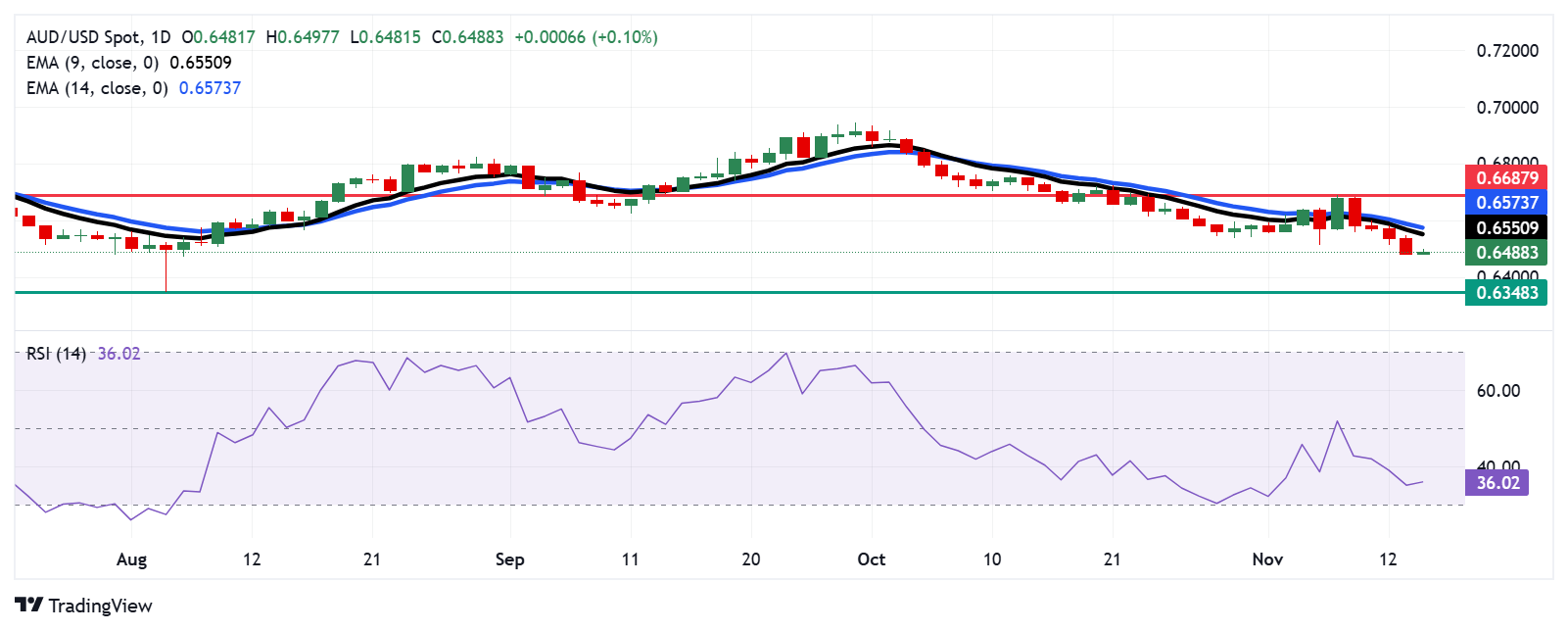 The AUD/USD pair trades near 0.6490 on Thursday. An analysis of the daily chart indicated short-term downward pressure, with the pair remaining below the nine-day Exponential Moving Average (EMA). Additionally, the 14-day Relative Strength Index (RSI) is below the 50 mark, reinforcing a bearish outlook.