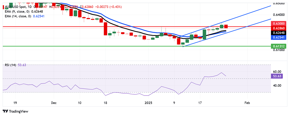 The AUD/USD pair trades near 0.6290 on Monday, showing upward movement within an ascending channel on the daily chart, hinting at a potential bullish bias. The 14-day Relative Strength Index (RSI) remains slightly above 50, supporting positive market sentiment.
