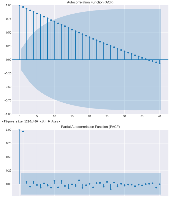 - The higher the significance of very long lags’ ACF on the time series, the more distant past values greatly impact today’s time series. This is what we found in this plot. The ACF slowly decreases, and even at lag 40, the ACF keeps being high.