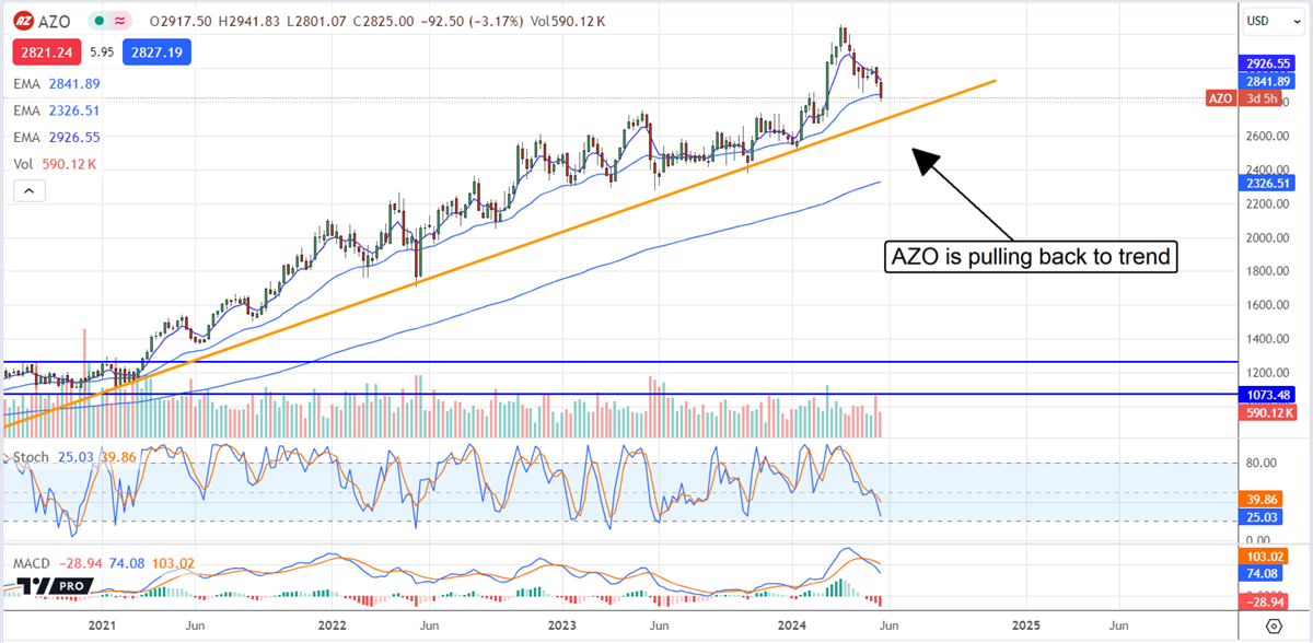 - AutoZone had a solid quarter, but results are mixed relative to consensus, and shares are pulling back.
