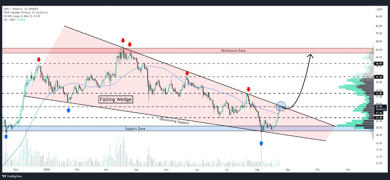 Technicals are aligning with the fundamentals. Popular analyst WHALES_CRYPTO says if Avalanche breaks through $27.56, it could move quickly toward price targets at $33, $41.50, $50 and possibly $60.50.