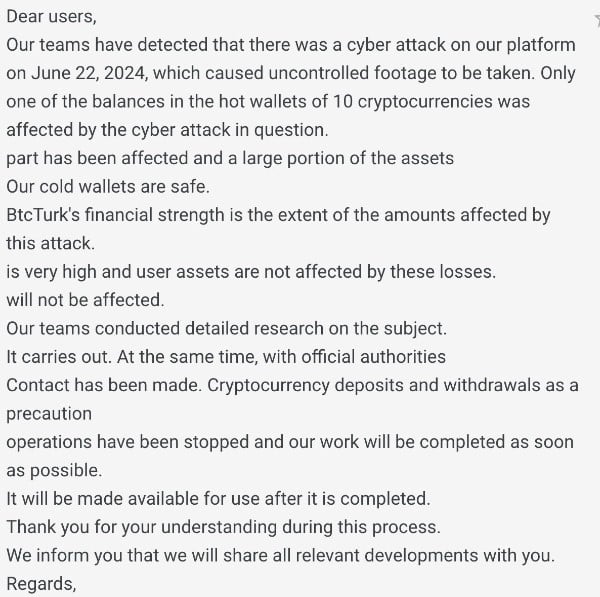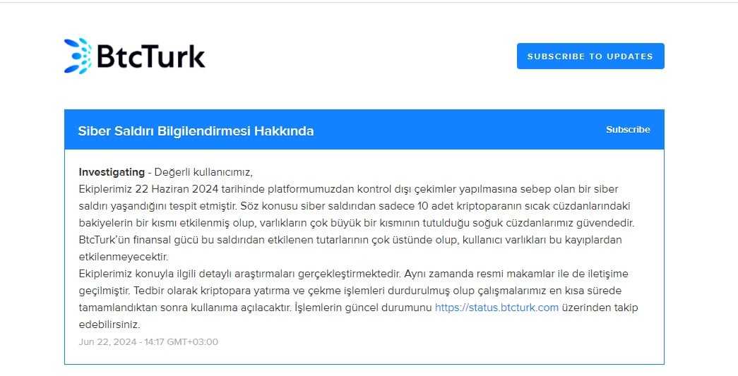 BtcTurk confirmed the cyberattack on June 22, which led to unauthorized withdrawals. The exact loss remains undisclosed, but the exchange assured that the majority of funds in cold storage are secure and user assets are not at risk.