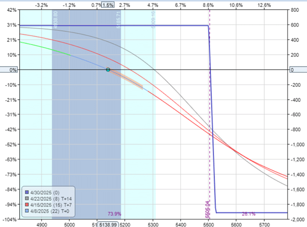 Suppose an option trader opens a bear call spread on SPX on April 8, 2025, at 12:30 pm EST with SPX at 5139.