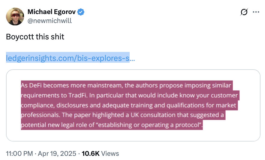“Many of their recommendations and conclusions — perhaps due to a mix of fear, arrogance, or ignorance — are completely uninformed and, frankly, dangerous,” CoinFund president Christopher Perkins said in an April 19 X post, referring to the BIS’ April 15 report titled “Cryptocurrencies and Decentralized Finance: Functions and Financial Stability Implications.”
