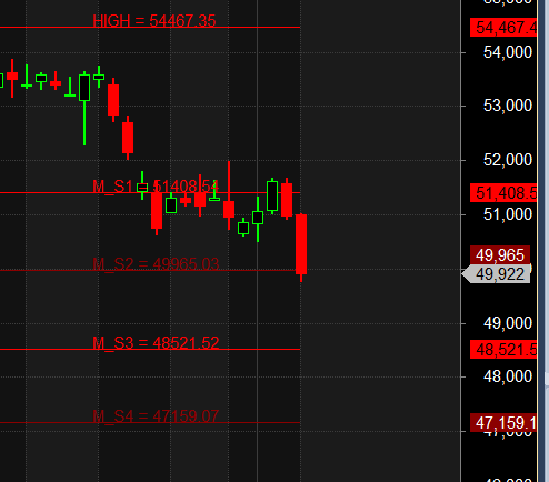 The price was initially at the Gann angle support zone of 1×1, but once this was broken in the morning, bears seized control, driving the price lower. Now, the price is likely heading toward the 3×4 Gann angle support zone near 50,000.