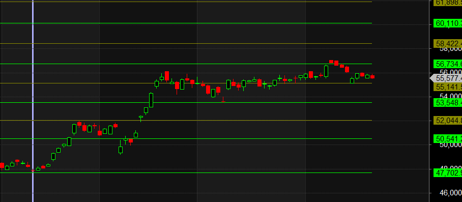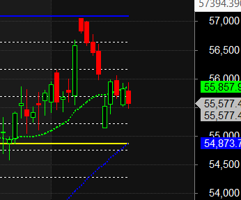 The Bank Nifty options chain shows that the maximum pain point is at 56000 and the put-call ratio (PCR) is at 0.65 Typically, when the PCR open interest ranges between 0.90 and 1.05, the market tends to remain range-bound. PCR is on extreme end suggesting we can see sharp reversal .