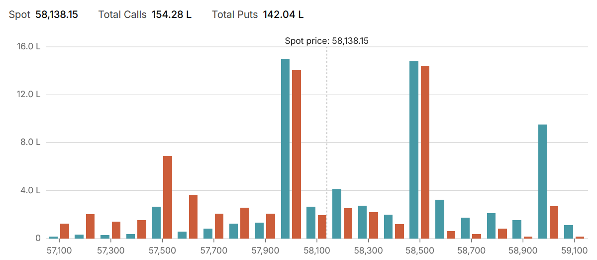 While the mood has improved, the physical landscape of the options chain remains dominated by the colossal positions at the 58,000 strike. As referenced in the visual structure, this level holds a massive concentration of both Call and Put Open Interest. This “short straddle” built by institutional writers acts as a powerful magnet. These sellers have a vested financial interest in the market expiring as close to this level as possible, and they will likely defend it with immense force, selling into any rally that moves too far above it and buying into any dip that moves too far below it. The Max Pain remaining steadfastly at 58,000 confirms that this remains the market’s inescapable focal point.
