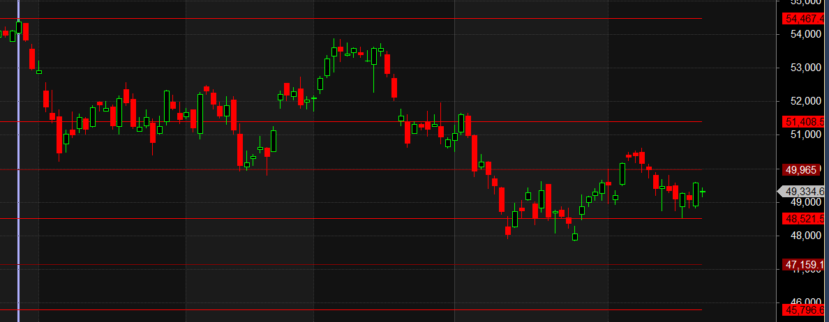 - Close above 49,186–49,242 → Could trigger a short-covering rally towards 49,700–50,000.