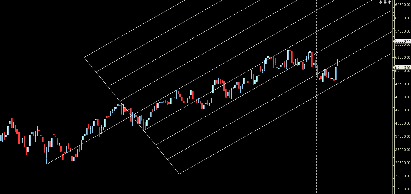 Price is entering its 1×1 gann angle resistance zone in range of 50800-51000.