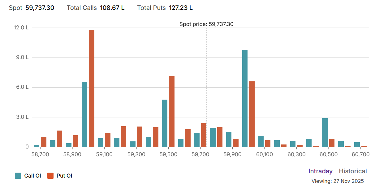 The two primary indicators both point towards underlying weakness. The Put-Call Ratio (PCR) stands at a wary 1.17. A PCR this high confirms that more Put options are being held than Calls, a clear sign of widespread hedging and a growing fear of a downside move. Further amplifying this concern is the Max Pain level, which is pegged far below the current market at 59,100. This suggests that option writers, who often have a better read on the market, see a higher probability of the price declining towards this level by expiry to inflict the maximum loss on option buyers.