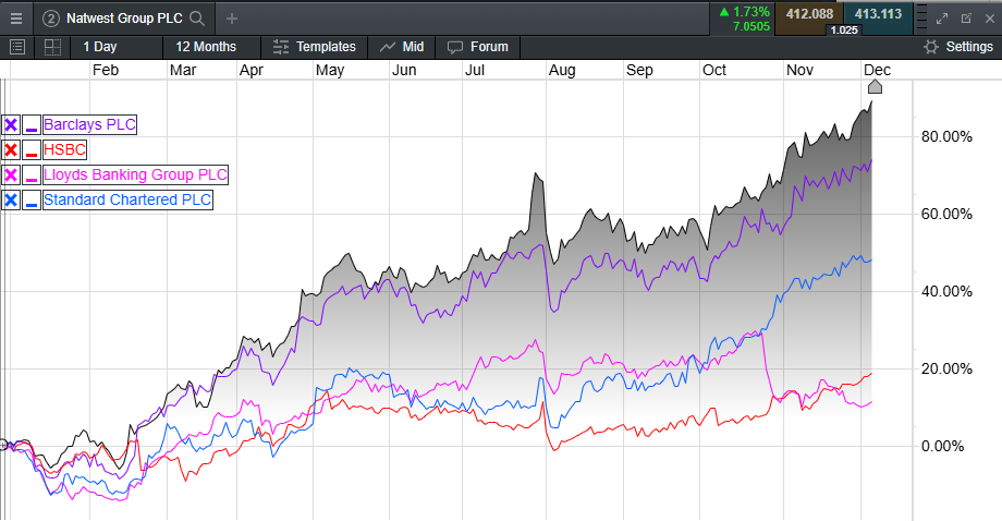The last 12 months have seen well overdue gains for the UK banking sector as Barclays and NatWest leading the sector high, also helped by the continued turnaround by Standard Chartered.