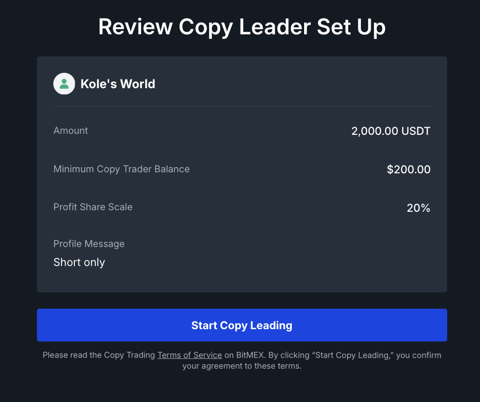 BitMEX предоставляет полнофункциональный интерфейс для управления вашими профилями лид-трейдера, отслеживания эффективности и корректировки настроек.