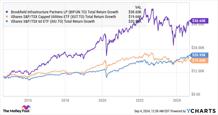 Over the last decade, a $10,000 investment in BIP.UN would have transformed to approximately $38,600, beating both the utility sector and the Canadian stock market, as shown in the graph below.