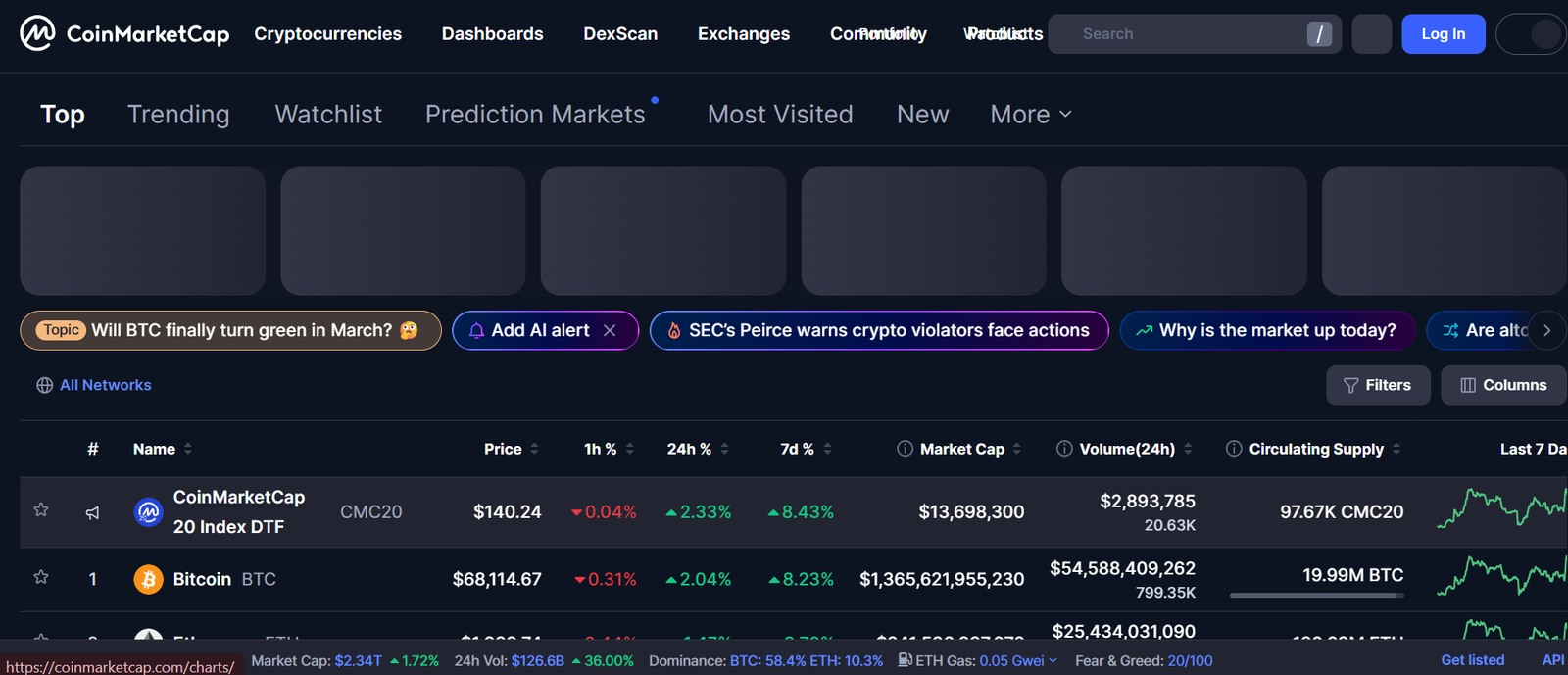 CoinMarketCap allows users to create watchlists separate from active holdings.