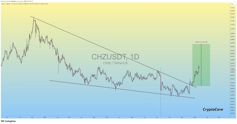 Although the CHZ price has dropped to $0.048, bulls have started another uptrend to retest the upper resistance. As of January 12, the Chiliz coin was trading at $0.050. Captain Faibik predicts that the value of Chiliz could soar to $0.082.