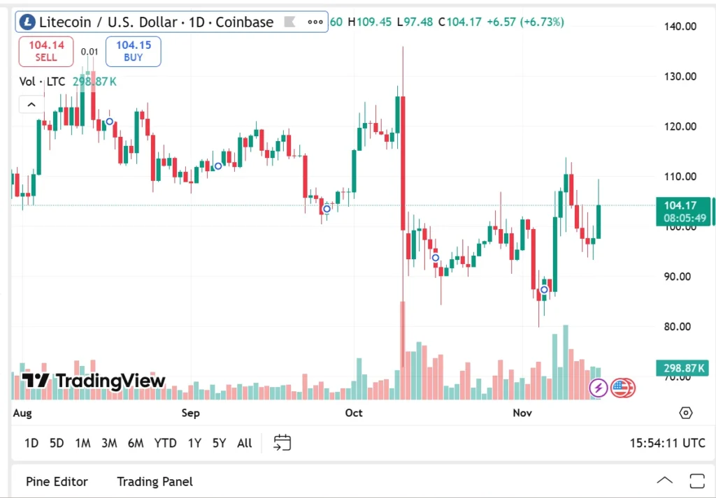 Litecoin has been stronger than Hedera so far, reaching $104.14 following the cryptocurrency’s 5.5% daily gain. Its market capitalization now sits at $8 billion with trading volume increasing 13.14% to $1.31 billion.