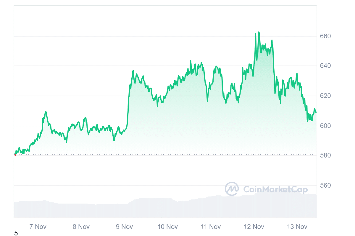 Currently, Binance Coin (BNB) is trading at $608.71, with a recent 5.74% price decrease over the last 24 hours. Nevertheless, the token has gained 4.77% over the past week, reflecting positive momentum. Market sentiment around BNB remains bullish, with the Fear & Greed Index indicating an “Extreme Greed” score of 84, often pointing to strong investor interest and increased market activity.
