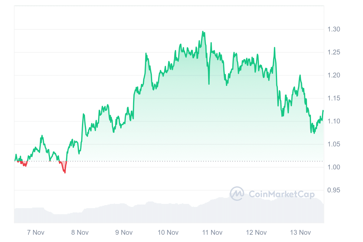 Currently, JUP’s price is $1.114797, with a significant daily trading volume of $450.93 million and a market cap of $1.50 billion, making up around 0.05% of the total crypto market. The price has dropped by 4.64% over the past 24 hours but has shown a 10.27% gain over the last seven days and a 34.77% increase in the past month.