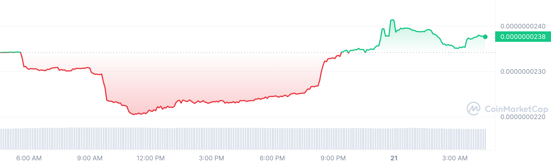 Investors have a bullish sentiment on VINU, and it has displayed a 1.45% and 17% price increase in 24 hours and seven days, respectively. It is currently priced at $0.00000002376. The token’s greed index of 71 (greed) and a perfect 30 green days in the previous 30 days show its potential for increase in the coming days.
