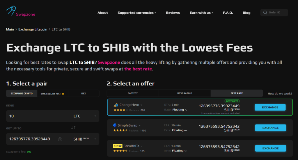 SwapZone is an independent and non-custodial crypto exchange aggregator that scans the network of all registered crypto exchanges globally and gives a list of all platforms that support the chosen trading pairs. This platform registered in Georgia has been monitoring and comparing cryptocurrency exchange rates since 2019. The exchange facilitates on-the-spot trading with its offer of about 1,000 assets ready to be swapped.