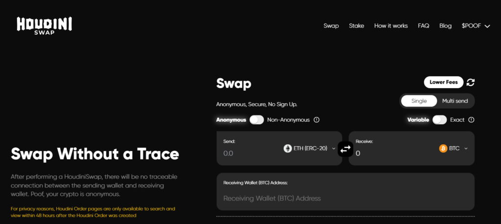 HoudiniSwap is a system of interconnected non-KYC exchanges that was launched in 2022. It uses the Monero blockchain to anonymize your transactions, automatically swapping from your desired input currency to Monero on one exchange, then sends the Monero to a different exchange and swaps the Monero to your desired receiving currency. The platform has its own token called POOF token.