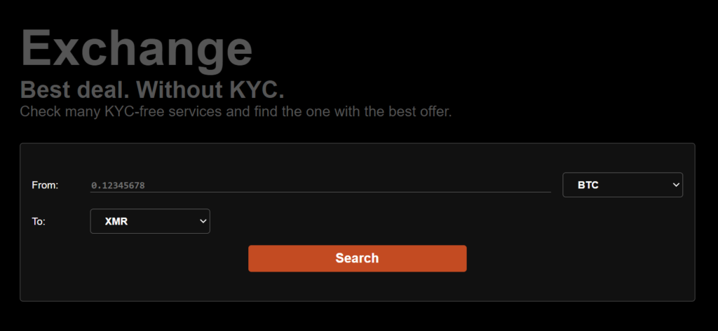 OrangeFren lets you quickly compare the rates among instant, KYC-free, exchanges trading Bitcoin, Bitcoin Cash, Ethereum, Litecoin, Monero, USDC, and USDT. The platform itself is exceptionally simple and doesn’t have a large crypto collection.