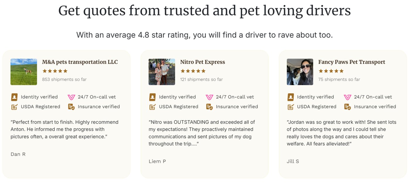 Each driver undergoes extensive vetting — from ID verification and background checks to optional USDA registration — ensuring your furry companion is in the hands of a trustworthy professional. Every driver profile includes bios, photos, and customer reviews, empowering pet owners to make informed decisions.