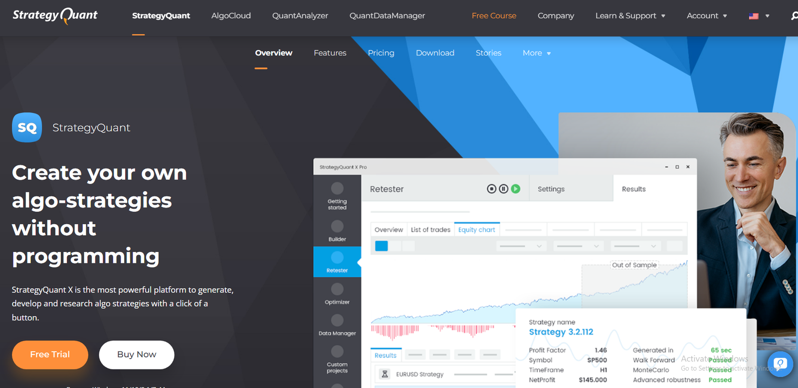 | StrategyQuant X | Algo traders | $1290 one-time | Trial | Strategy generation | 4.8 |