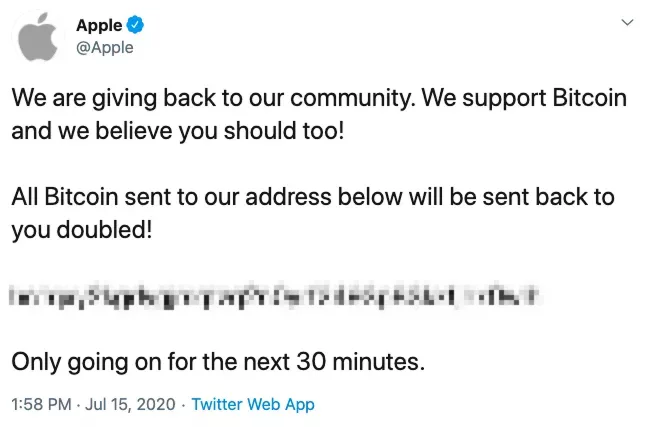 In July 2020, there was a coordinated hack of multiple Twitter accounts at the same time, including the accounts of Barack Obama, Joe Biden, Bill Gates, Jeff Bezos, Warren Buffett, Apple, and Uber. Each account posted the same message: “send me $1,000 in Bitcoin and I will send you $2,000 back.”