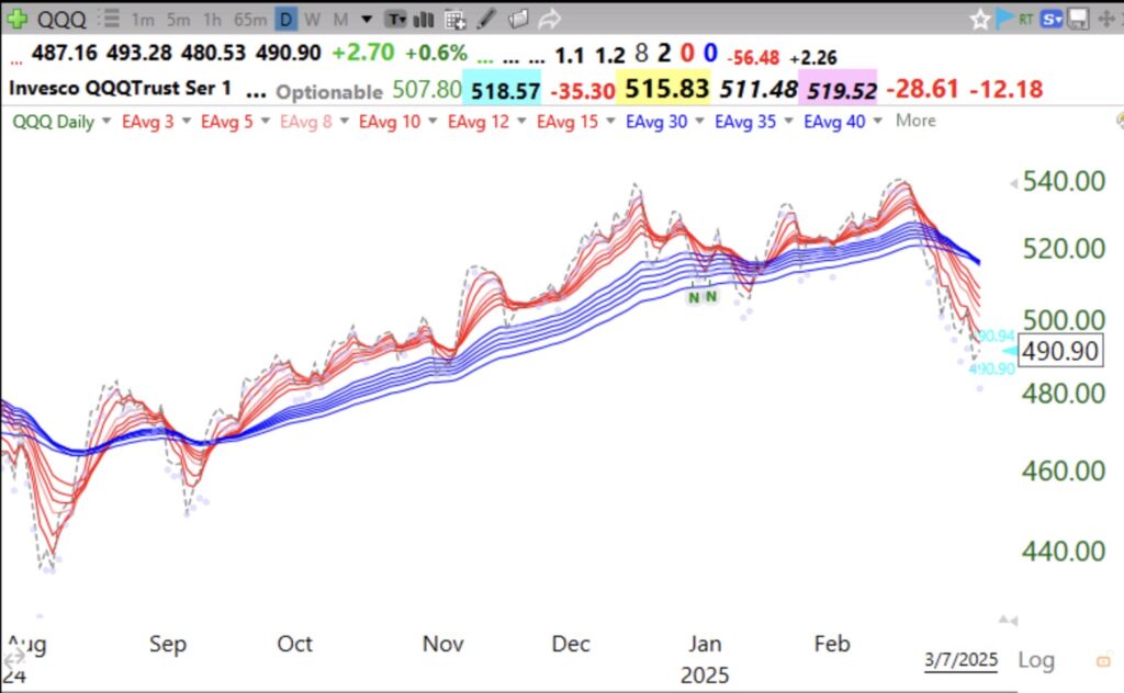 I have shown repeatedly that buying the triple leveraged ETF, TQQQ, in a QQQ short term up-trend beats almost all individual stocks. The same can be true for buying the inverse ETF, SQQQ, on Day 1 of a QQQ short term down-trend. The problem is that this is very difficult to do. Day 1, by definition, is a change in trend and most people do not believe it. For me the best strategy is to take a small position on Day 1 and add to it only if the trend continues. One must be nimble, however, because the trend could end at anytime. A final comparison I made was to compare SQQQ to all stocks in my watchlist of growth stocks. I find that during this period since February 25, 11 of 559 stocks, or about 2%, advanced more than SQQQ. Good luck to finding such rare stocks in advance on Day 1! If one misses buying SQQQ on Day 1, there is a greater risk that SQQQ may trade down.