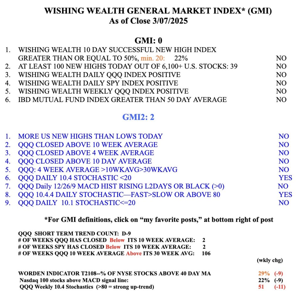 The GMI is 0 and I remain largely on the sidelines. If we get a good bounce I will transfer more retirement funds out of mutual funds and into money market funds. However, my university contributions to my retirement account will continue to accumulate S&P500 mimicking mutual funds, which is dollar cost averaging. The S&P500 as a group, but not all individual stocks, will eventually recover. I still think we are at the beginning of a significant market decline. Watch to see if the 10 week average (blue dotted) declines below the 30 week average (red line). We are not there yet but QQQ has closed below the 30 week average, a very ominous sign. We are also in a daily BWR down-trend, see chart 2. But beware of the brief bear market rallies that can seduce one to go long. There is plenty of time to wade back in once the GMI turns Green.