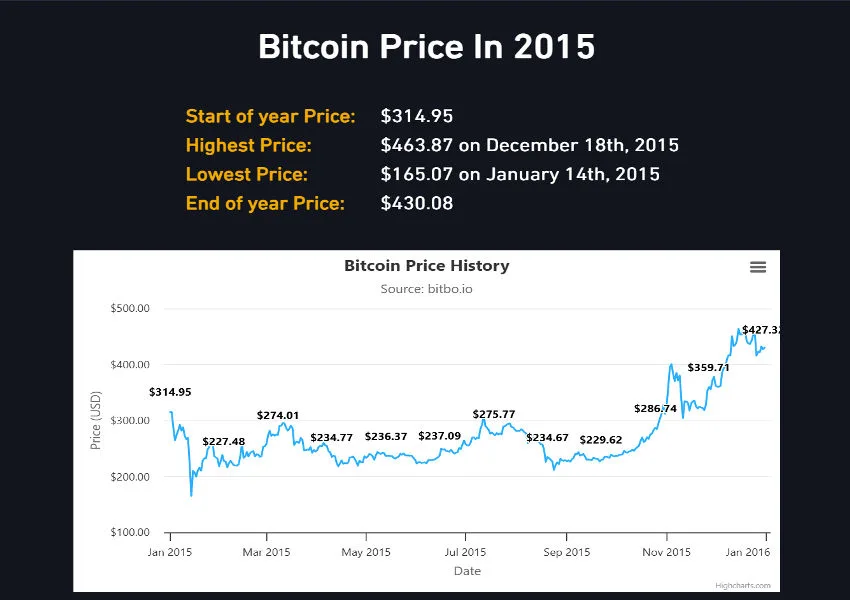 | 2015 | ~$315 | ~$464 (Dec) | ~$165 (Jan) | ~$430 | Capitulation followed by stabilisation and early recovery |