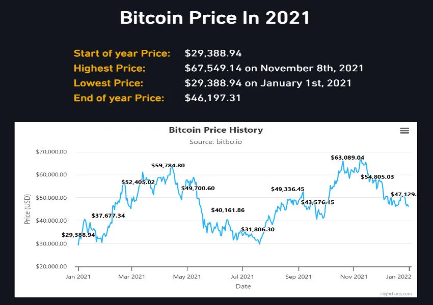 | 2021 | ~$29,389 | ~$67,549 (Nov) | ~$29,389 (Jan) | ~$46,197 | Institutional inflows, two-peak bull market, China mining ban mid-cycle |