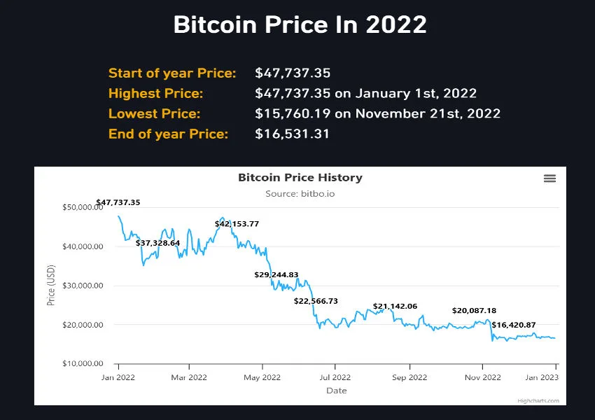 | 2022 | ~$47,737 | ~$47,737 (Jan) | ~$15,760 (Nov) | ~$16,531 | Global rate hikes, liquidity contraction, major crypto industry failures |