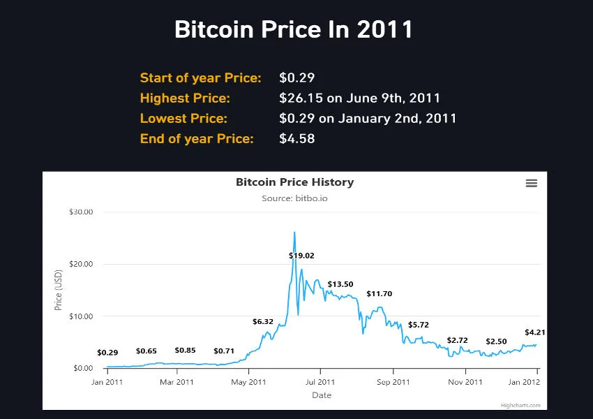 | 2011 | ~$0.29 | ~$26.15 (Jun) | ~$0.29 (Jan) | ~$4.58 | Thin liquidity, exchange outages, early speculative bubble |