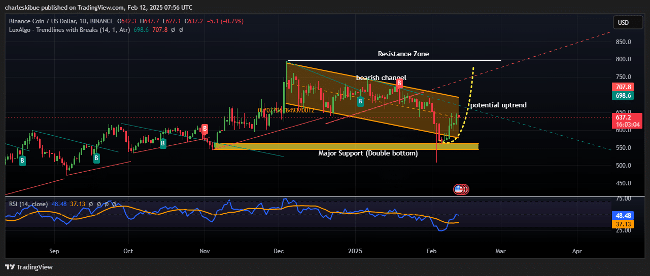 The price is now attempting to break free from the descending channel, a move that could trigger a fresh rally toward the $700-$750 resistance zone. If bulls manage to sustain momentum above this range, a further push toward $850, a crucial psychological and technical level, could be in play.