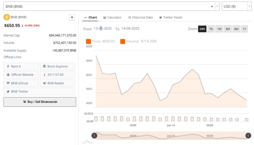 Additionally, the 24-hour chart offers a clearer picture of BNB’s attempts to recover. After a brief intraday spike to $655, the price retraced to $652 before climbing back above $650, where it continues to consolidate.