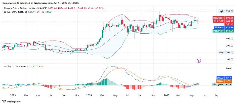 On the weekly timeframe, data from X shows BNB trading near $650.48, positioned just below the upper Bollinger Band at $691.94. The narrowing of recent candlesticks and wicks on both ends indicates indecision, yet the trend remains moderately bullish.