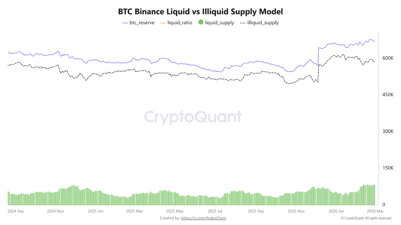 Arab Chain reveals in the post that Binance currently holds a total of around 670,000 BTC in its reserves. Of that amount, approximately 83,000 BTC stands as the liquid supply, and about 587,000 BTC exists as an illiquid supply, placing the liquidity ratio at around 12%. It is also worth noting that the current liquid supply portion stands close to levels that were last seen in 2024.