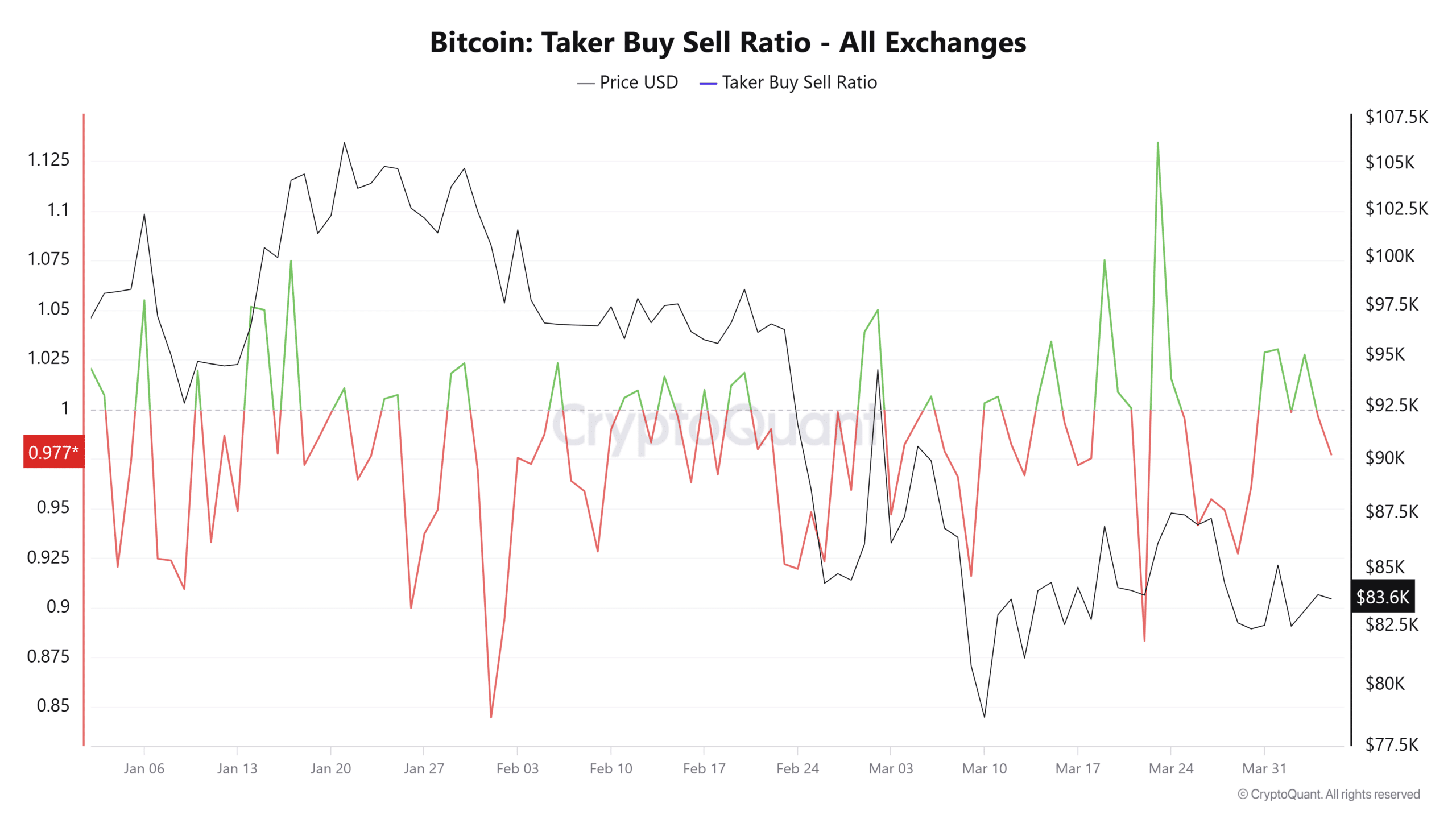 According to the Taker Buy/Sell Ratio — which uses a scale of 1 (above indicating buying, and below indicating selling) — the current reading is 0.977 and trending downward.