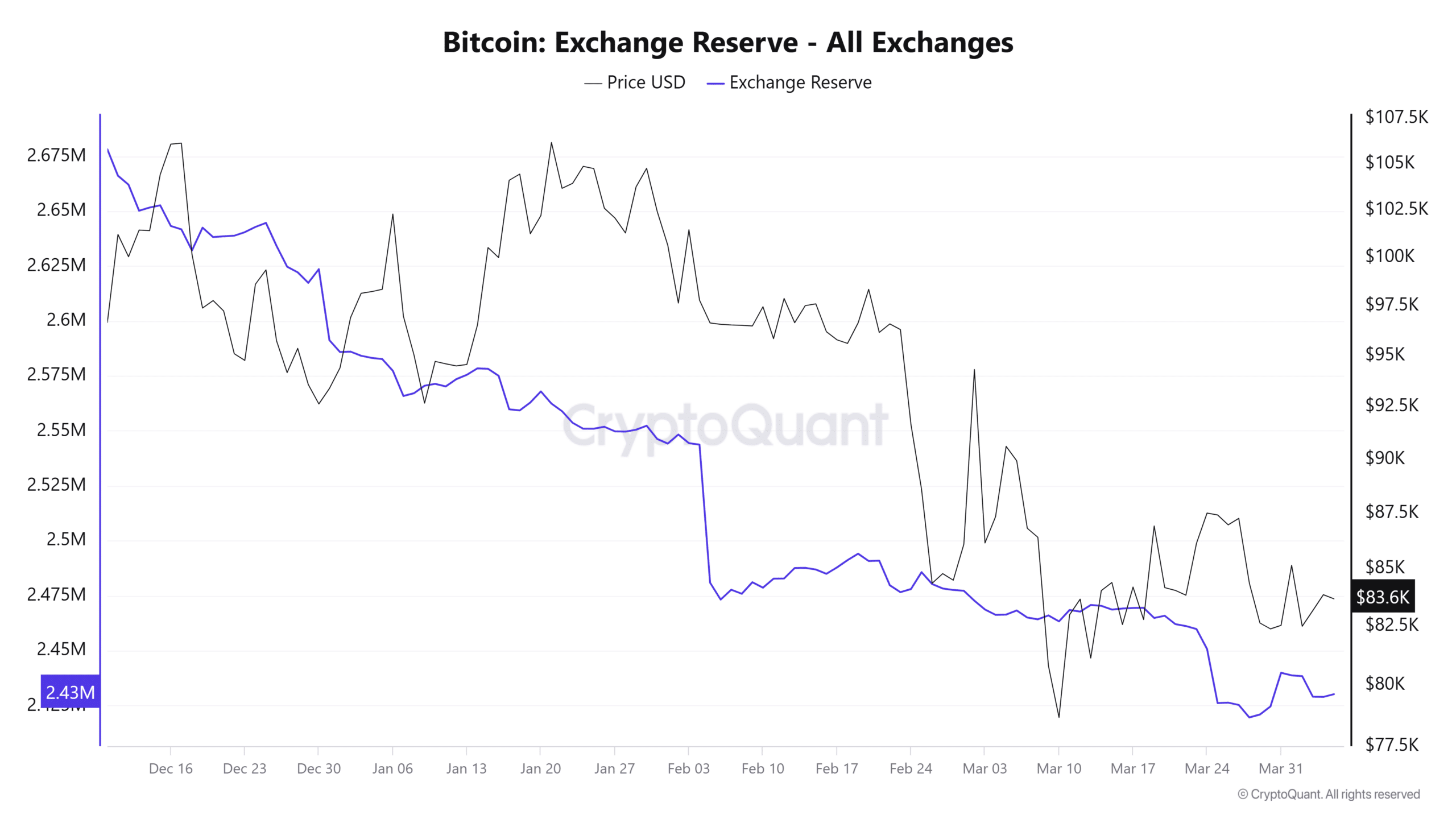Analysis of market activity shows a push toward the downside. At the time of writing, there was a slight increase in the amount of Bitcoin on exchanges, as exchange reserves grew to 2.43 million.
