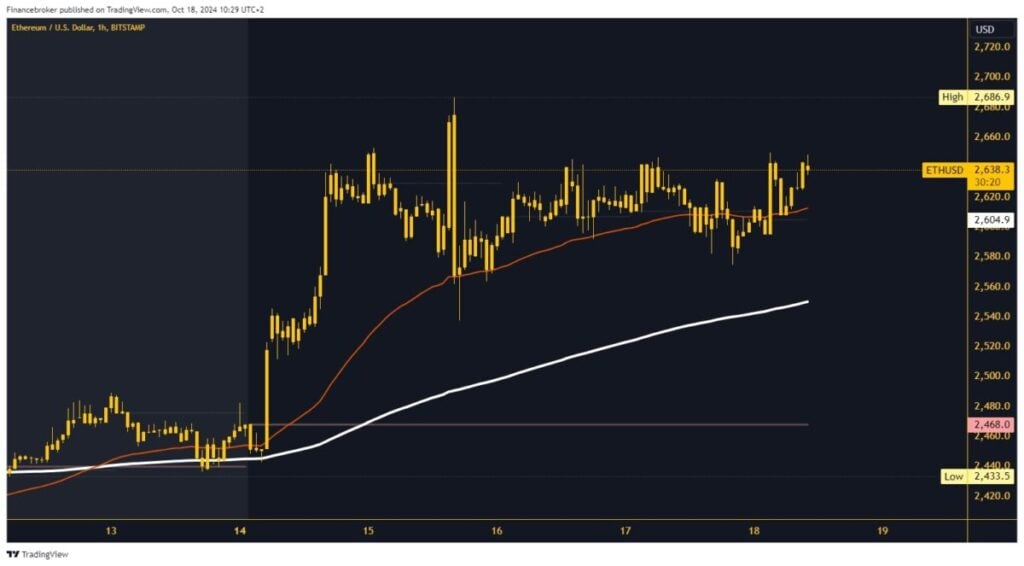 Ethereum price continues to consolidate above $2600 on Friday, October 18. We have resistance in the $2650 zone for the second day in a row. The price ponovo nailazi na otpor u toj zoni i fall to $2635. Now, we need a new level of support in order to stay on the bullish side and continue the growth. Potential higher targets are $2660 and $2680 levels.