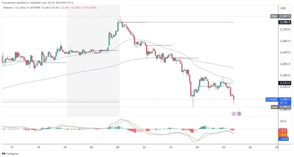 Yesterday, October 24, the price of Ethereum had a new attempt to recover but again encountered the same resistance at the $2650 level. We started the retreat from there again last night, which continued on Tuesday, October 25. Ethereum formed a daily low at the $2461 level and came significantly closer to the weekly low of $2450. Now, we are monitoring how the price will behave in this zone because we could easily see a continuation to the bearish side and the formation of a new weekly low.