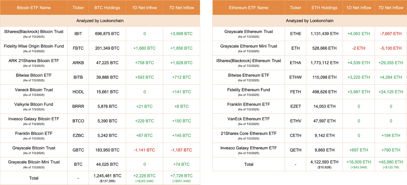 Across all Bitcoin-focused ETFs, the total holdings have reached 1,245,481 BTC, showing a net weekly increase of 7,726 BTC. The overall net inflow for Bitcoin ETFs during this period is 2,226 BTC, which amounts to about $245.34 million. While Bitcoin maintains dominance in the ETF space, its performance is mixed, with some funds showing positive growth and others experiencing outflows.