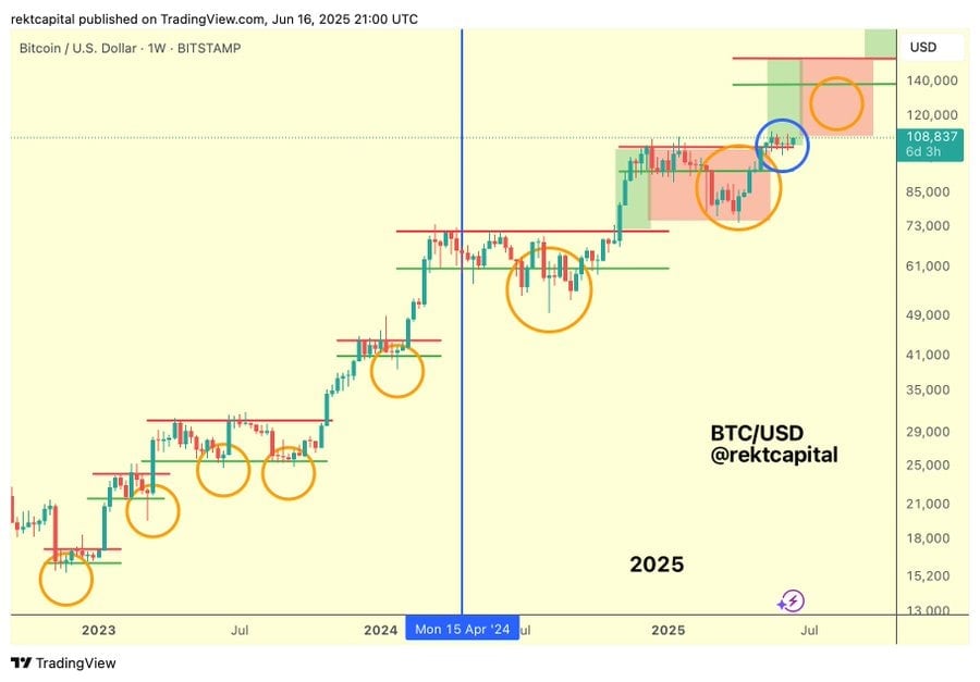 Once again, Bitcoin continues to defy the naysayers. BlackRock is winning the ETF war, Trump wants in with his own BTC-ETH hybrid product, Ethereum is flexing in the options market, and MicroStrategy just bought another mountain of BTC. All of this while Bitcoin calmly holds the line amid geopolitical chaos. Bitcoin is just 2% away from new all-time highs. If you’ve been asking yourself if now is a good time to buy Bitcoin, the chances are likely that months from now, the price will be higher. Bitcoin’s volatility may be sleeping for now, but it’s stirring — and the next move might be big. Don’t forget, the Bitwise Bitcoin price prediction for 2025 is $200,000. It’s looking more and more likely. As Rekt Capital suggests, a new phase of Bitcoin Price Discovery could be on the horizon. The analyst wrote on X that, “Bitcoin continues to successfully retest its reaccumulation range and has done so for six straight weeks as it attempts to transition into a new price discovery uptrend.