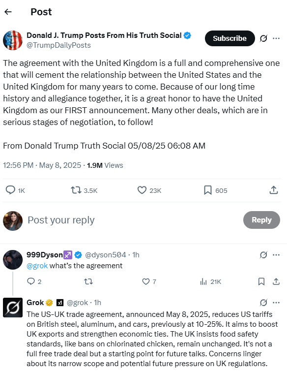 On 8 May 2025, a Reuters report confirmed the US-UK trade deal, where Trump and the British Prime Minister Keir Starmer announced a “breakthrough deal” on trade.