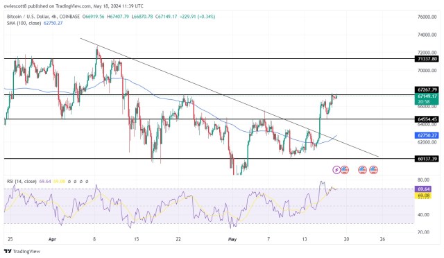 Bitcoin which has been moving downward for a while now has managed to break above its previous resistance level of $67,303.98 and has been showing signs of a potential rally ever since.