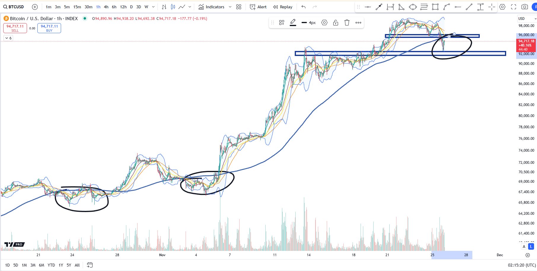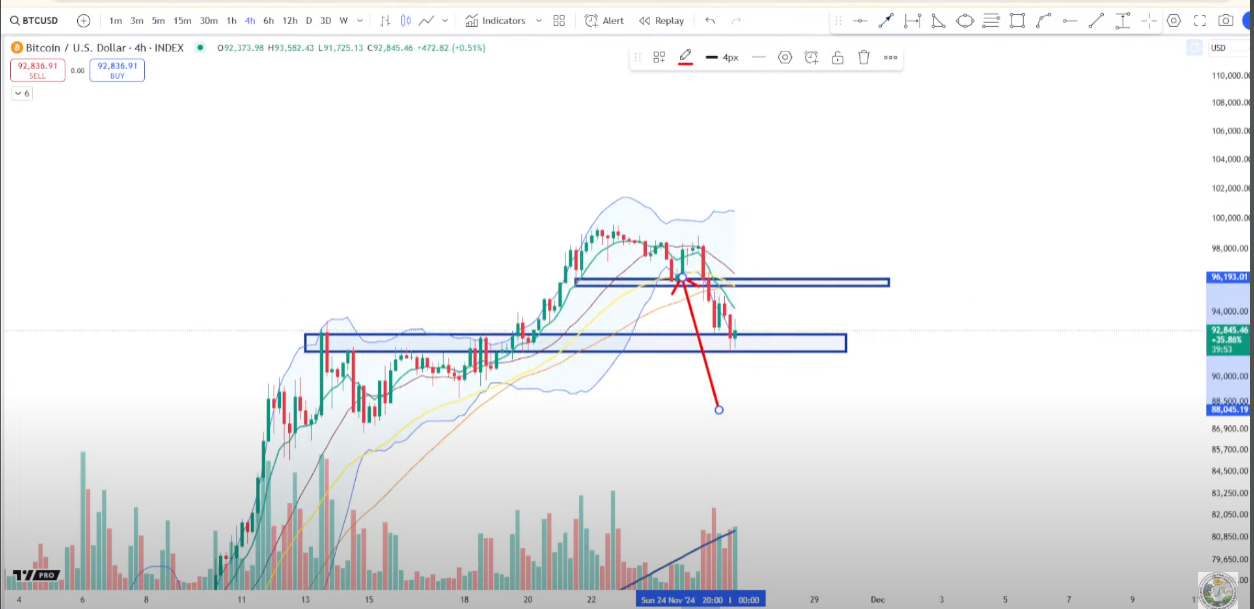 “The reason I said that is from a momentum standpoint, that would signify a retest of the prior range peak and then you would be jumping back up to the top of the range and recapturing lost support where the price tried to hold initially at that first level here at $96,000.”