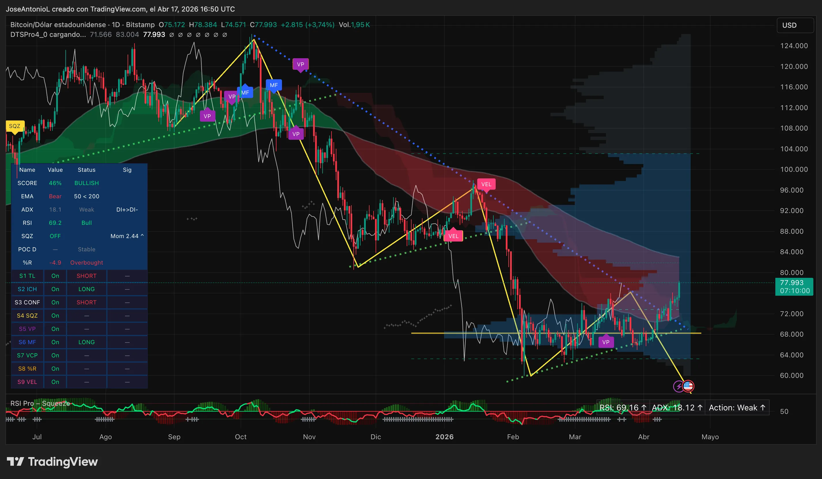 Overall, in an optimistic scenario, Bitcoin holds above the broken trendline (now acting as support around $74,000–$75,000), and the ADX begins climbing above 20–25. If bears take over again, a new rejection, combined with RSI rolling over from near-overbought levels, sends Bitcoin back to test the support area. A break below that turns the broken resistance back into resistance, invalidating the breakout.